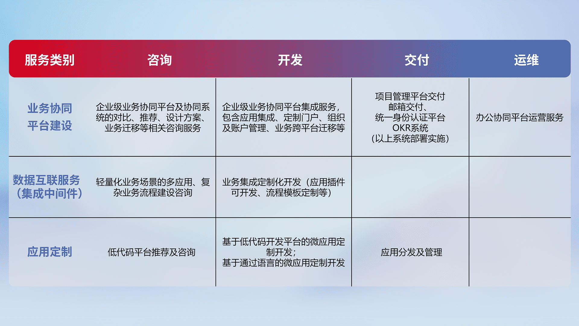 针对钉钉、、、企微、、、、IDaas等平台级产品提供产品的规划、、方案、、交付、、、、定制化开发等服务,,,,实现如统一协同办公、、、智能客户服务、、、、混合会议管理、、、智能数据查询、、、等业务场景,,实现数字化转型。。。